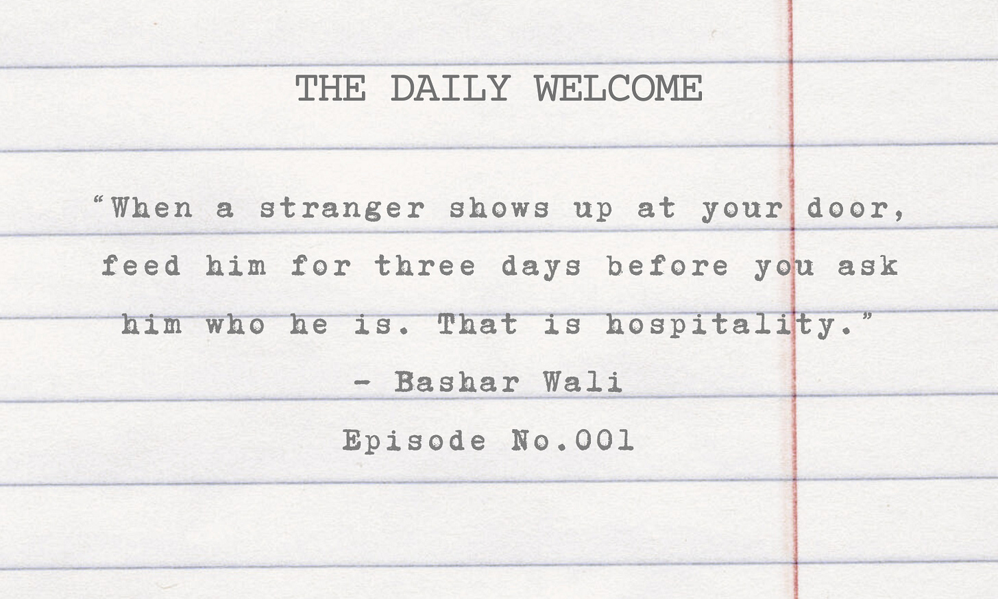 The Daily WelcomeDaily Welcome: Feed Him for Three DaysInspired by Defining Hospitality Episode No. 001 with Bashar WaliDan RyanOct 22, 2025ShareHospitality begins before curiosity.Before credentials.Before the question who are you?It begins with the act itself — the meal, the welcome, the care freely given.Next