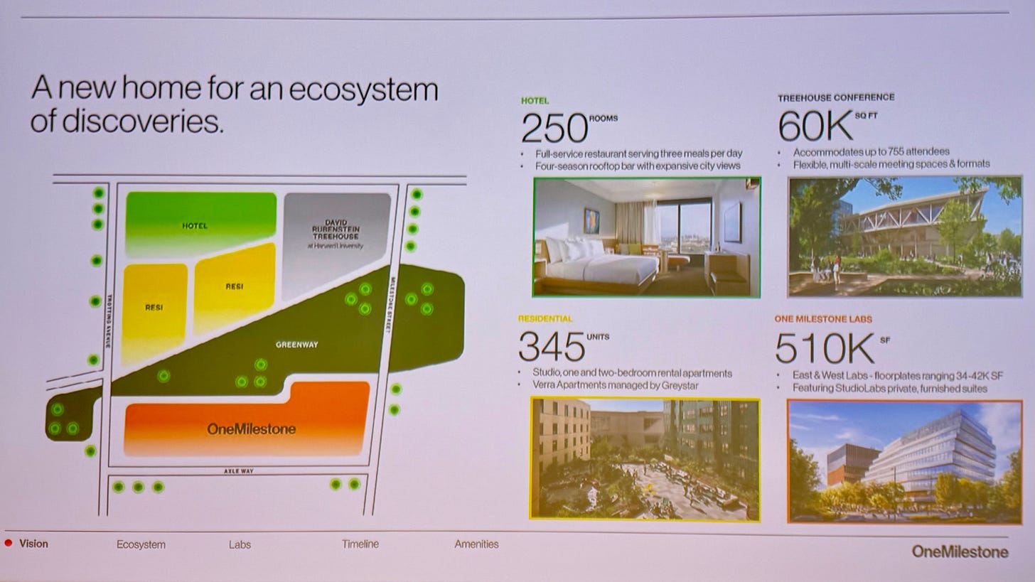 Here’s what’s on the ground: the Atlas Hotel (250 keys, operated by Highgate), the David Rubinstein Treehouse Conference Center (Harvard’s first university-wide conference center), One Milestone (500,000 square feet of purpose-built lab space), 345 residential units, and a two-acre Greenway that will eventually connect the Charles River to the Honan library in upper Allston, activated with farmers markets, concerts, movie screenings, and art installations.