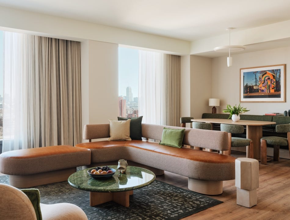 I should say a word about the guest rooms, since I slept in one last night and BERMANFALK provided the furniture. Inc. Architecture & Design out of New York created the interiors, and they designed something that everyone on my room tour said felt grounded, calming, and connected the colors in the expanse below the windows into the rooms. The leather daybed, the green marble coffee table, the muted tones against those floor-to-ceiling windows with views out over Cambridge. It’s residential in the best sense: you feel like you’re staying in someone’s very well-designed apartment, not checking into a hotel.