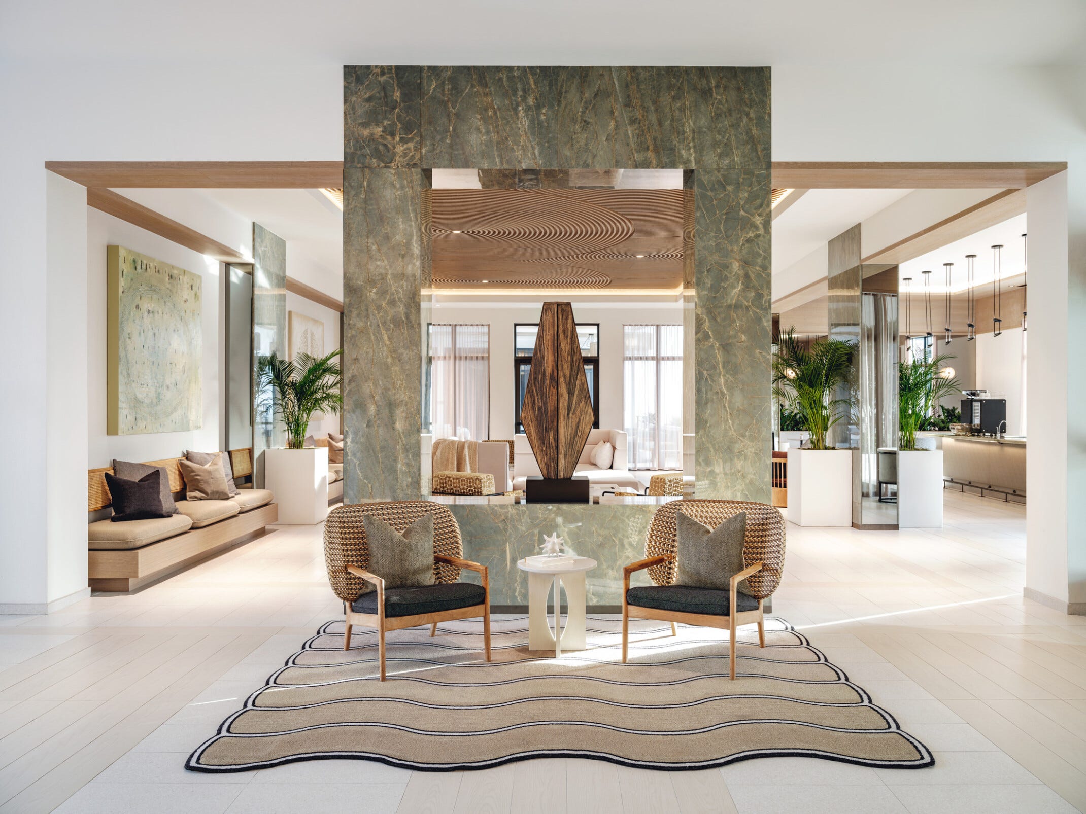 They coordinated with a millworker in Bulgaria to deliver intricate wood ceilings and cypress-inspired details that run from lobby to rooftop bar.