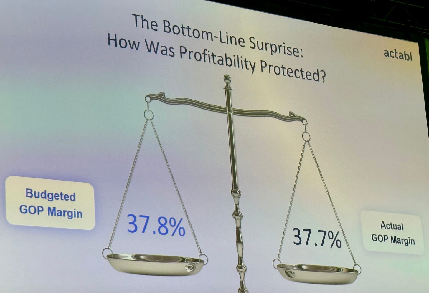 Even with top-line revenues down 15%, GOP margins were flat. “You’re pivoting,” she told them. “You’re finding the inflection points.” Her example: resorts cutting room labor costs by $14 per occupied room—saving roughly $300,000 a year without hurting guest experience. And as I always believe - you can’t change things without measuring them, so I’m guessing that Actabl provides some pretty detailed telemetry to the operators who are crushing it.