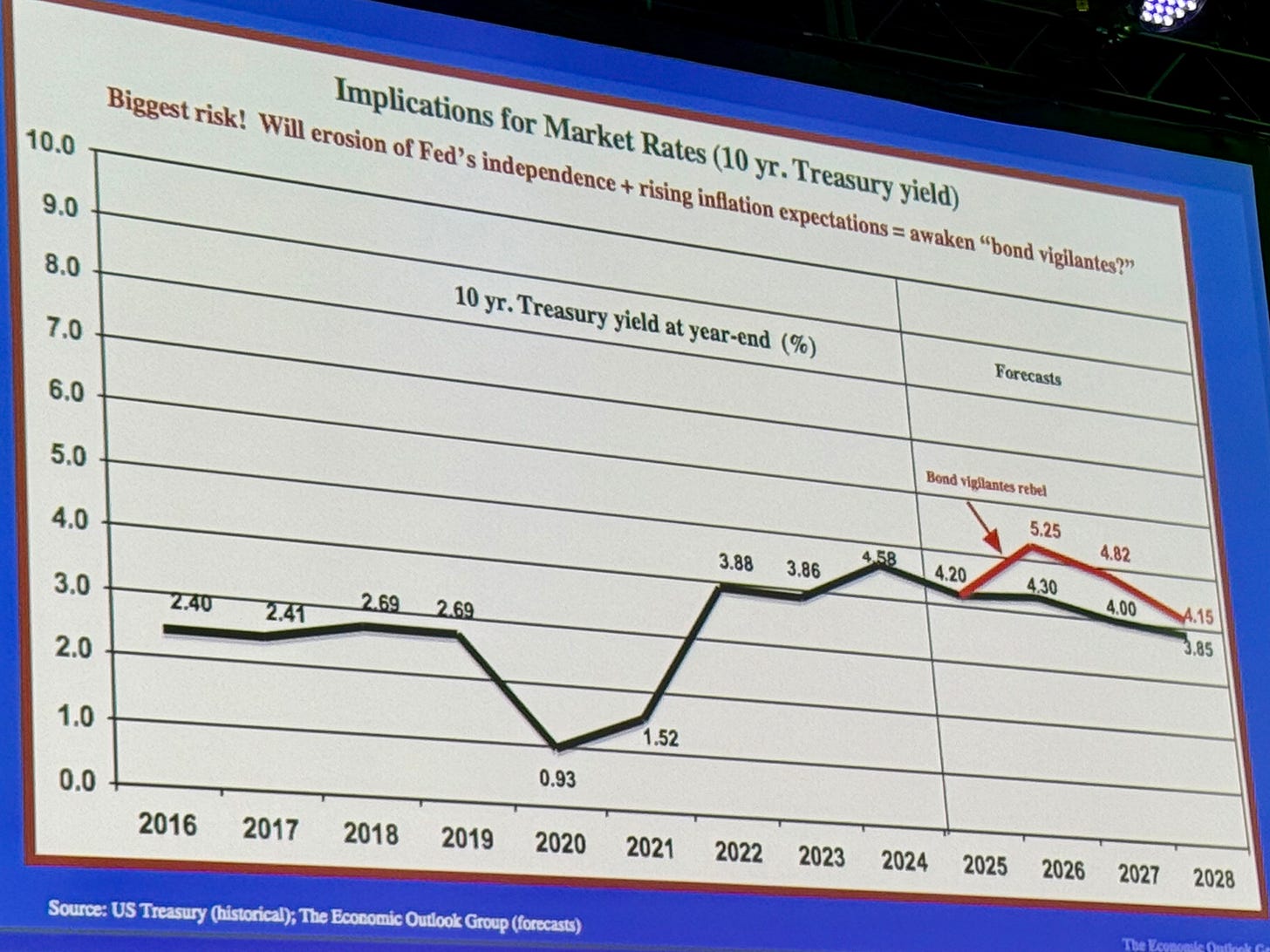 Then came economist Bernard Baumohl, who could’ve been mistaken for a stand-up comic if his topic weren’t so grim. “No recession,” he said. “Just chaos.” Tariffs, Treasury yields, shutdowns, stagflation threats—take your pick. It reminds me of a common Scott Galloway, “Prof. G” statement that - “The only adult in the room is the ten-year bond.” - he puts the odds of the bond vigilantes below driving up rates at 40%. So let’s all hope the 60% path takes hold.