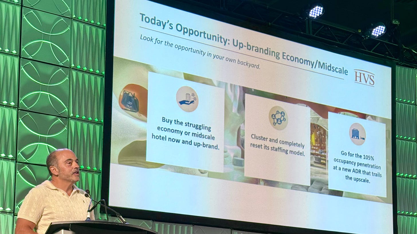 Harry Javer’s “laxative” opener got the room laughing, but the laughter faded as the data rolled in. Rod Clough of HVS urged the crowd to “seize the opportunity” in the overlooked corners of the market. “Buy the nine-and-a-half cap,” he said. “Transform the value. Up-brand. Be patient.”